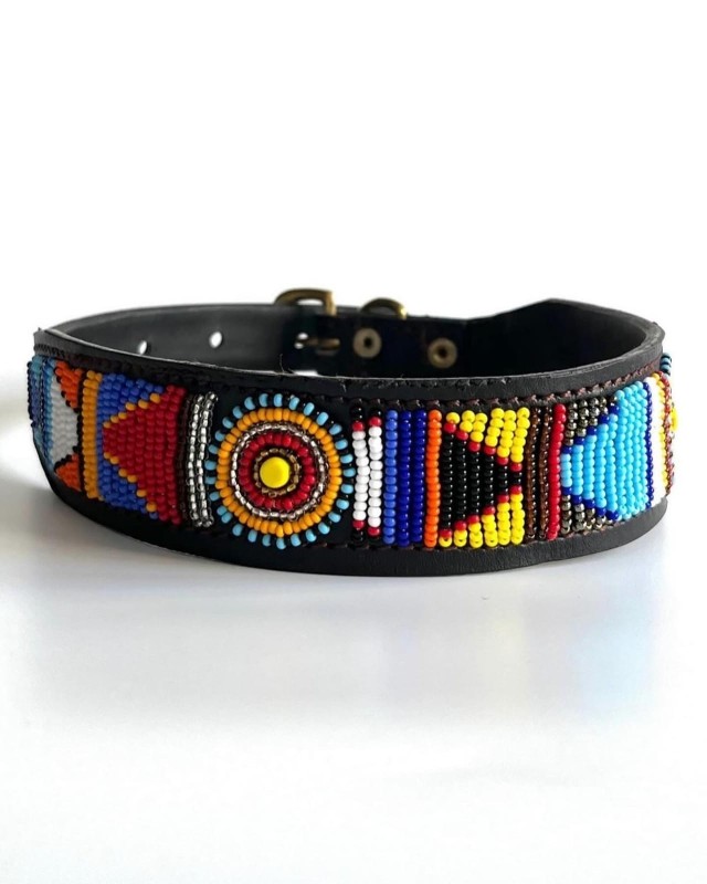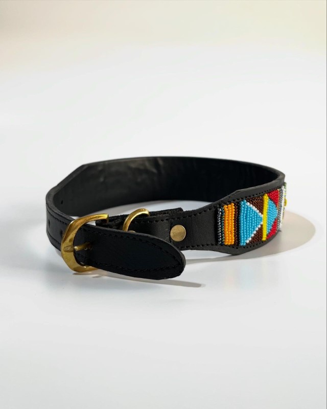 A perfect blend of style and strength. This Beaded Leather Dog Collar combines rugged durability with intricate Maasai-inspired beadwork. Features •Quality Leather. ? •Quality Brass Hardware. •D-Ring for Leash attachment.